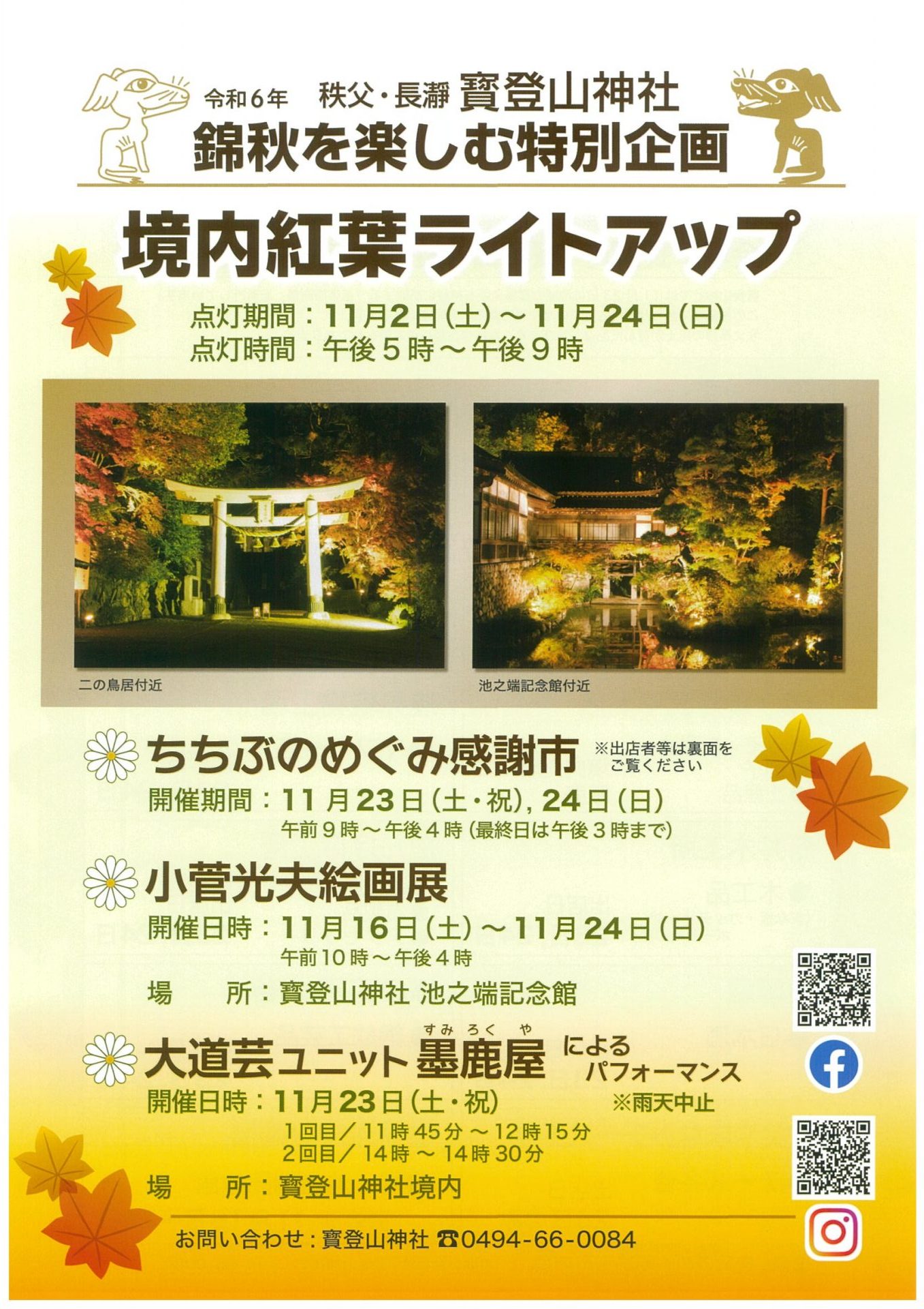 🍁境内紅葉ライトアップ 11月2日(土)~24日(日)🍁ちちぶのめぐみ感謝市 11月23日(土)~24日(日)🍁小管光夫絵画展 11月16日(土)~24日(日)🍁大道芸ユニット墨鹿屋によるパフォーマンス 23日(土)