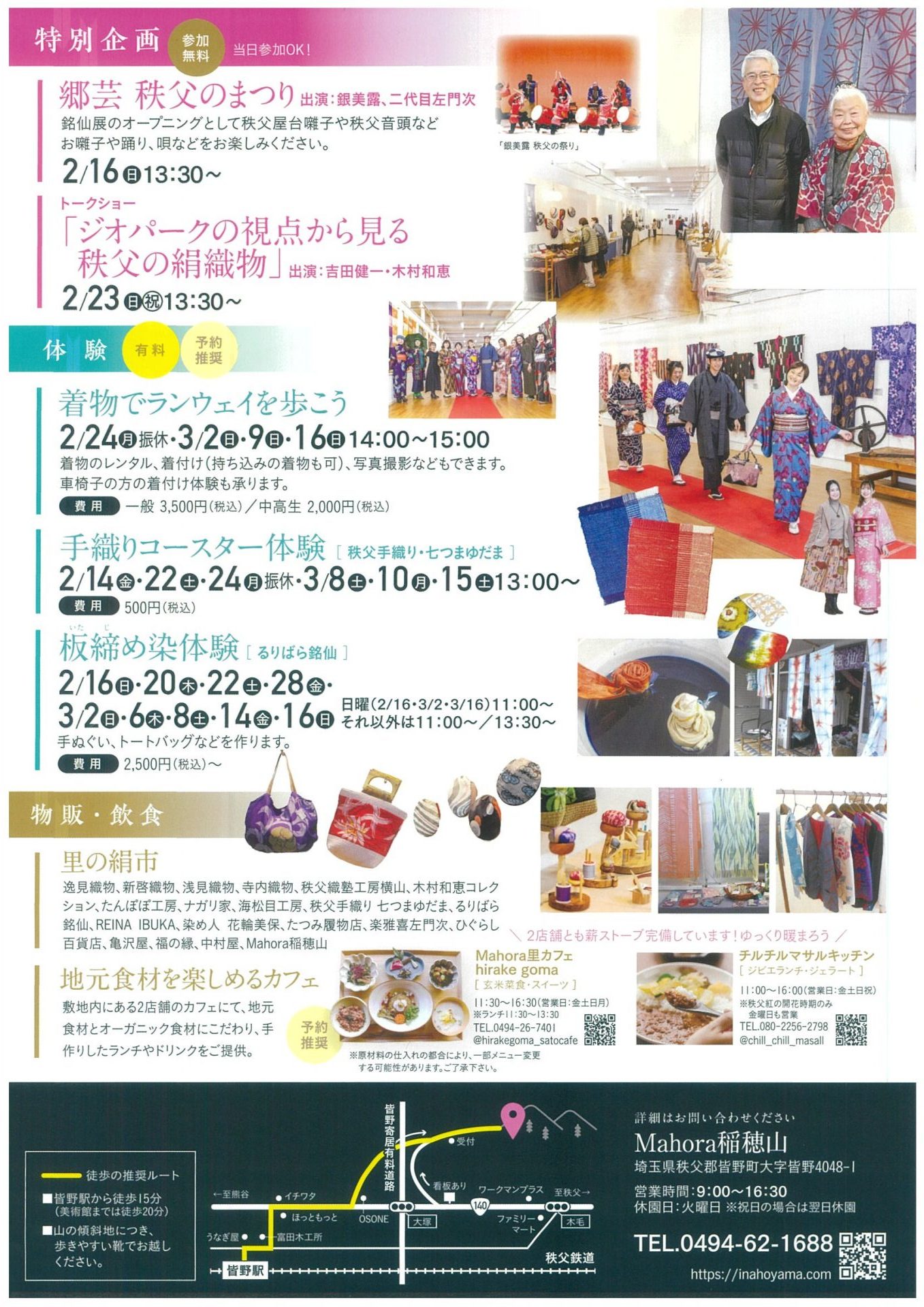 歴史を紡いできた味わいのある「秩父絹」の着物の展示や、トークイベント、着付けと撮影体験、ものづくり体験、銘仙小物販売があります。