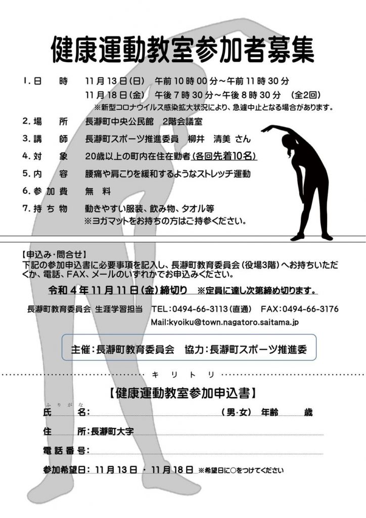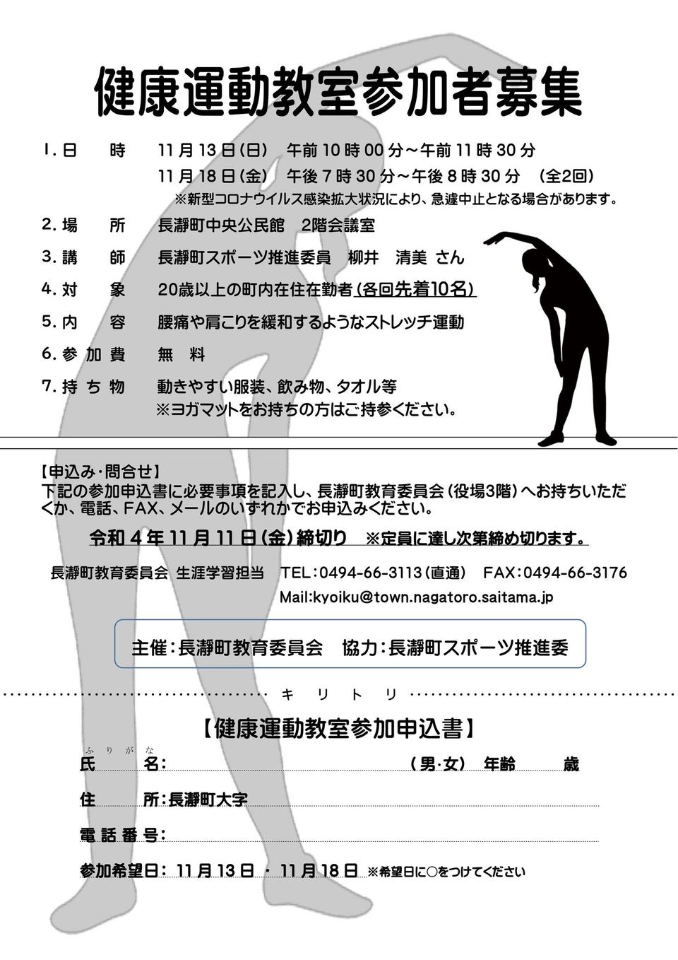 長瀞町スポーツ推進委員の柳井さんによる、腰痛や肩こりを緩和するストレッチ等の健康運動教室を開催します。