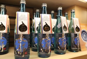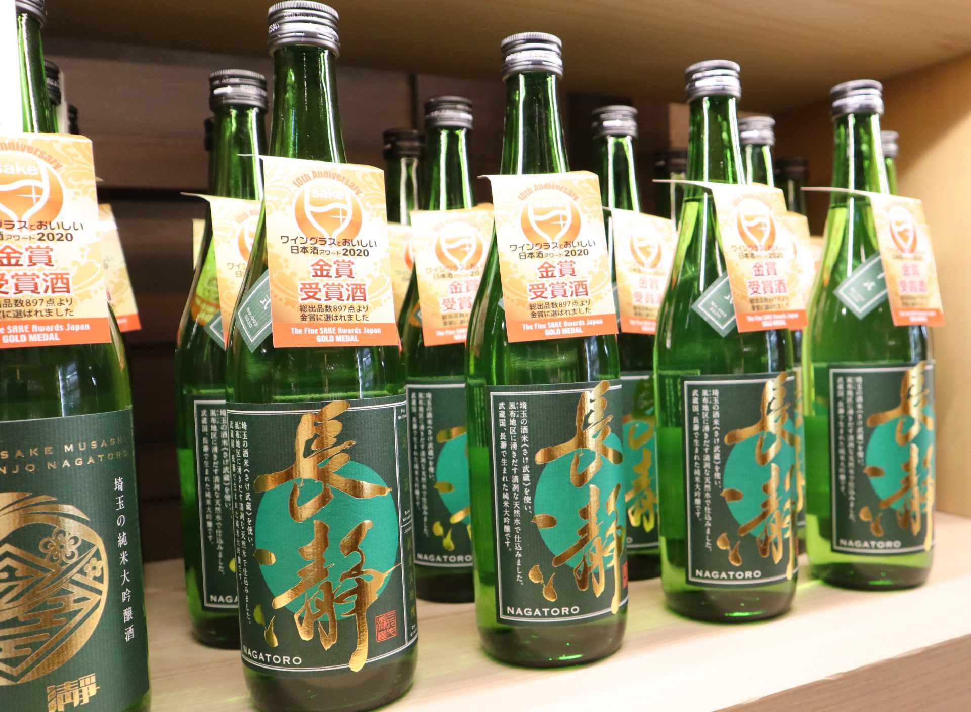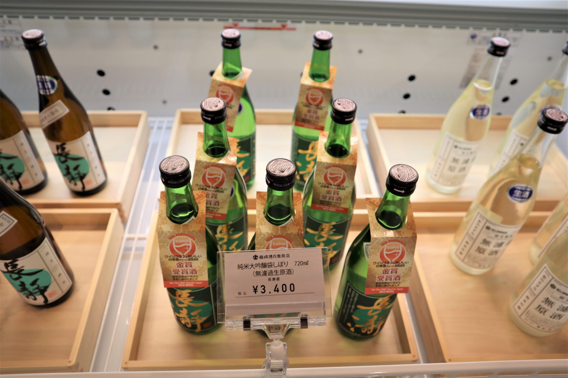 様々な種類の日本酒が並んでいます。青のボトルの「長瀞純米吟醸酒」は、今年フランスで金賞を取ったそうです!