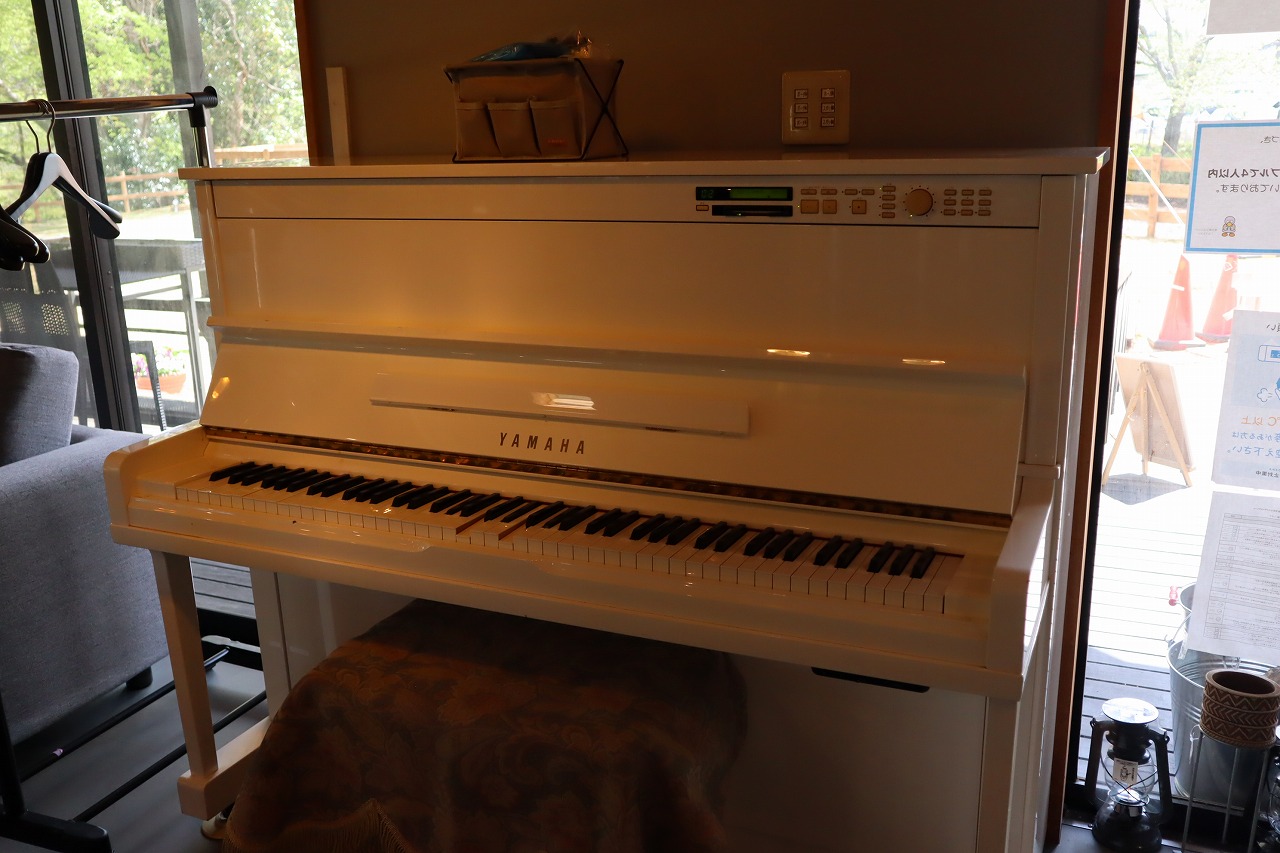 店内には、テーブル席とソファー席があります。また、白い自動演奏ピアノが存在感を感じさせます。