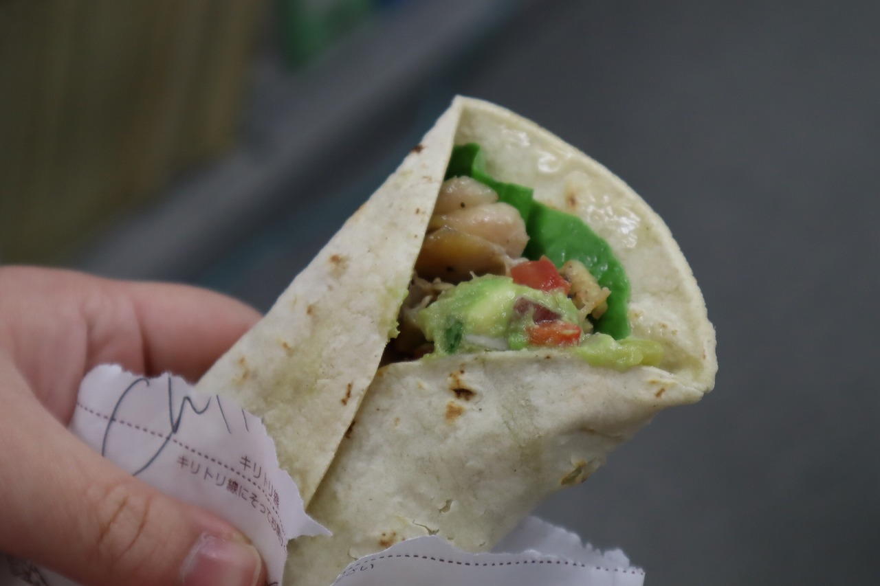タコス(チキン)の皮が固めで、パリパリ感が少しあります、