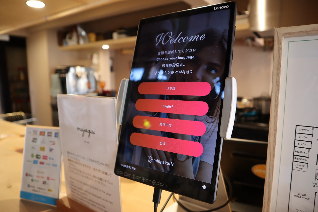 チェックイン・チェックアウトはこちらのタブレットで行います。